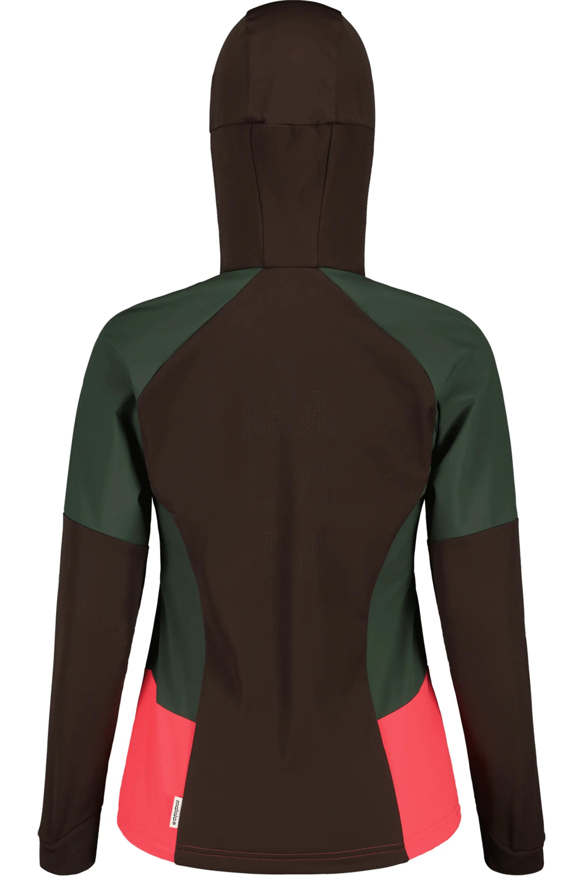Materiál Stormshell Light na přední straně a horní části rukávů a Thermal Stretch Eco s větracími laser řezanými otvory na zádech dělají z této hybridní bundy ideálního partnera pro outdoor v chladných dnech. Horizontální nápis Maloja vedle zipu na hrudi.