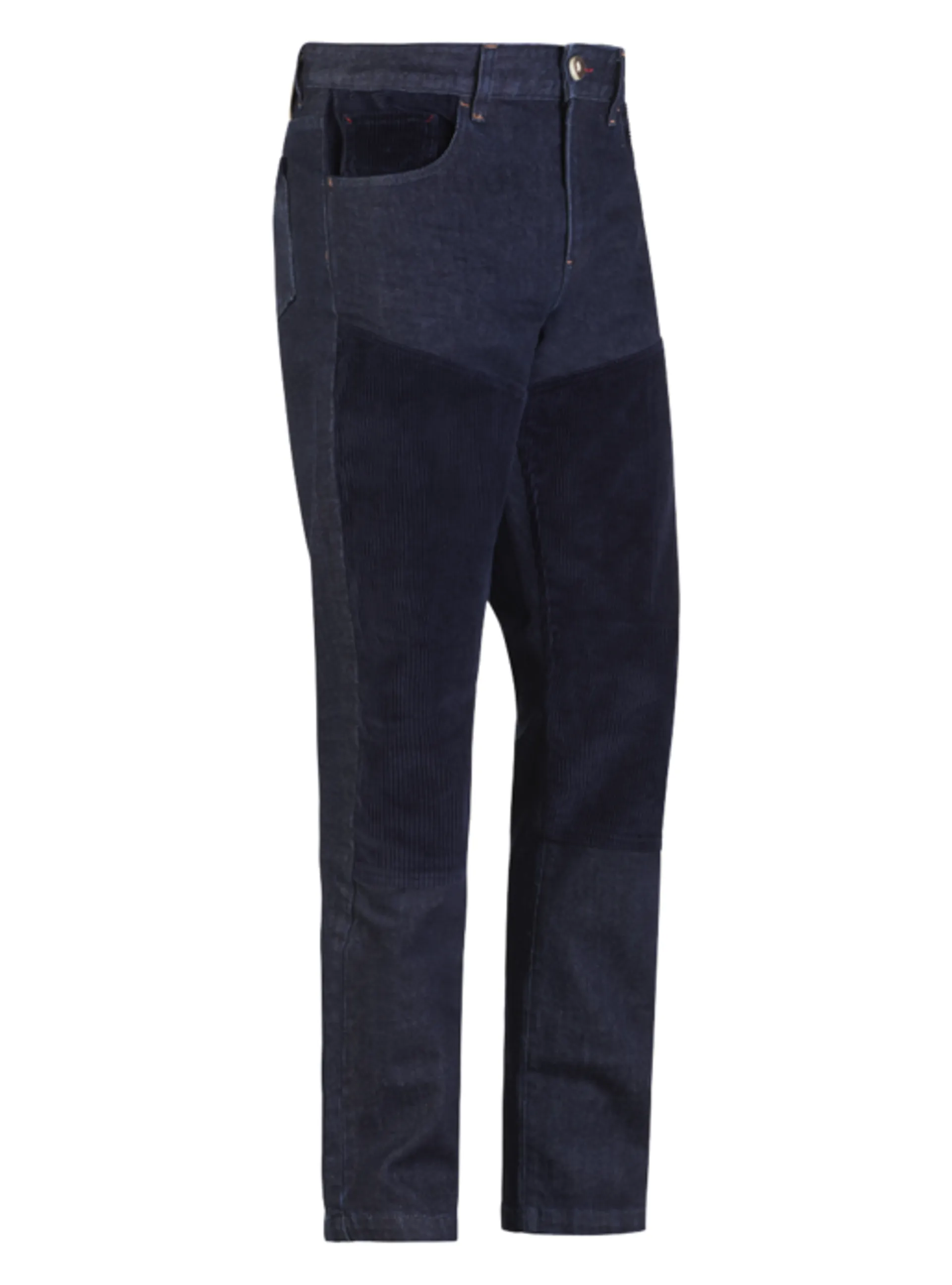 Džínovina se zkroucením to nabízejí tmavé džíny s pěti kapsami a manšestrovými vsadkami vyrobené z balvny s minimálním podílem elastomerových vláken.