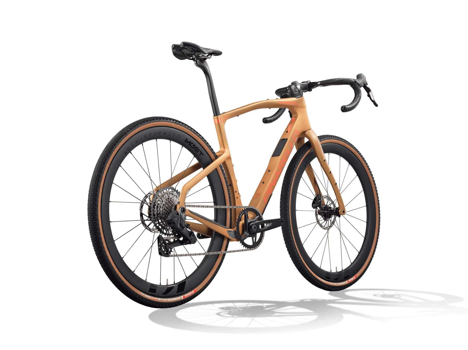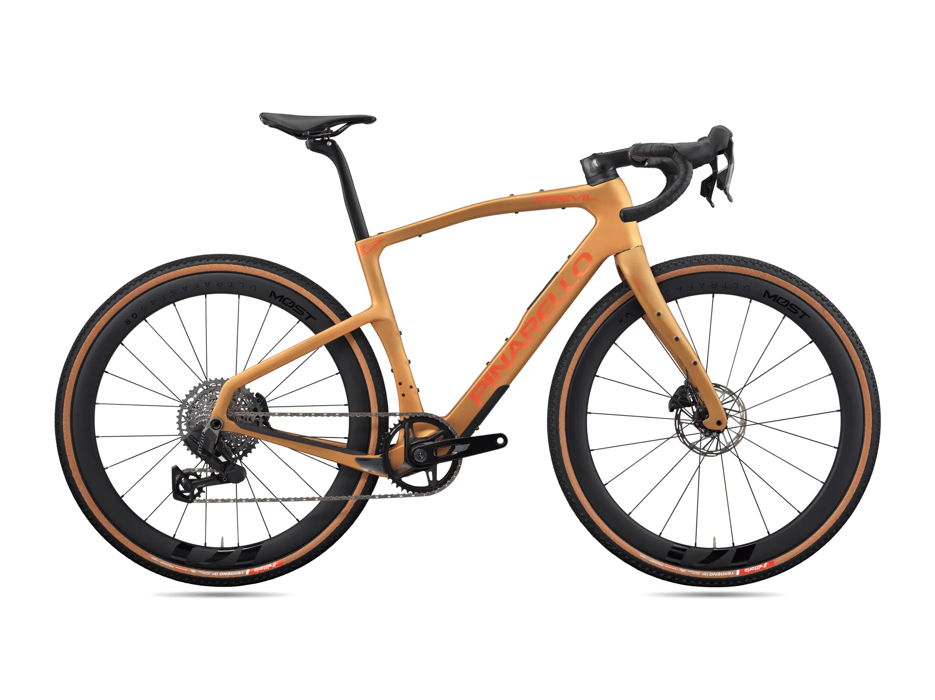 Gravel kolo s karbonovým rámem Pinarello Grevil F5, které spojuje rychlost silničního stroje s jistotou v terénu. Lehký a tuhý karbonový rám z vyspělých vláken s asymetrickou konstrukcí a karbonovou vidlicí ONDA tlumí vibrace a zvyšuje stabilitu. Aerodynamicky tvarované profily a vnitřní vedení kabeláže (TiCR) zajišťují čistý kokpit a plynulý průtok vzduchu. Velkorysá průchodnost plášťů pro 700C i 650B umožní použít široké tubeless pneumatiky pro lepší přilnavost, pohodlí a kontrolu na šotolině, lesních cestách i asfaltu. Hydraulické kotoučové brzdy Flat Mount dávají přesnou dávkovatelnost výkonu, pevné osy 12 mm přidávají jistotu v zatáčkách i při sprintu. Spolehlivé elektronické řazení SRAM RIVAL XPLR AXS si zamilujete díky snadnému ovládání. Rám je kompatibilní s 1x i 2x převody (Shimano GRX / SRAM XPLR včetně elektronického řazení), takže kolo snadno vyladíte pro závody, rychlé tréninky i bikepacking. Úchyty pro košíky a brašny rozšiřují praktičnost. Výsledkem je univerzální gravel – rychlý, stabilní a pohodlný na dlouhé vzdálenosti, připravený na objevování bez omezení.