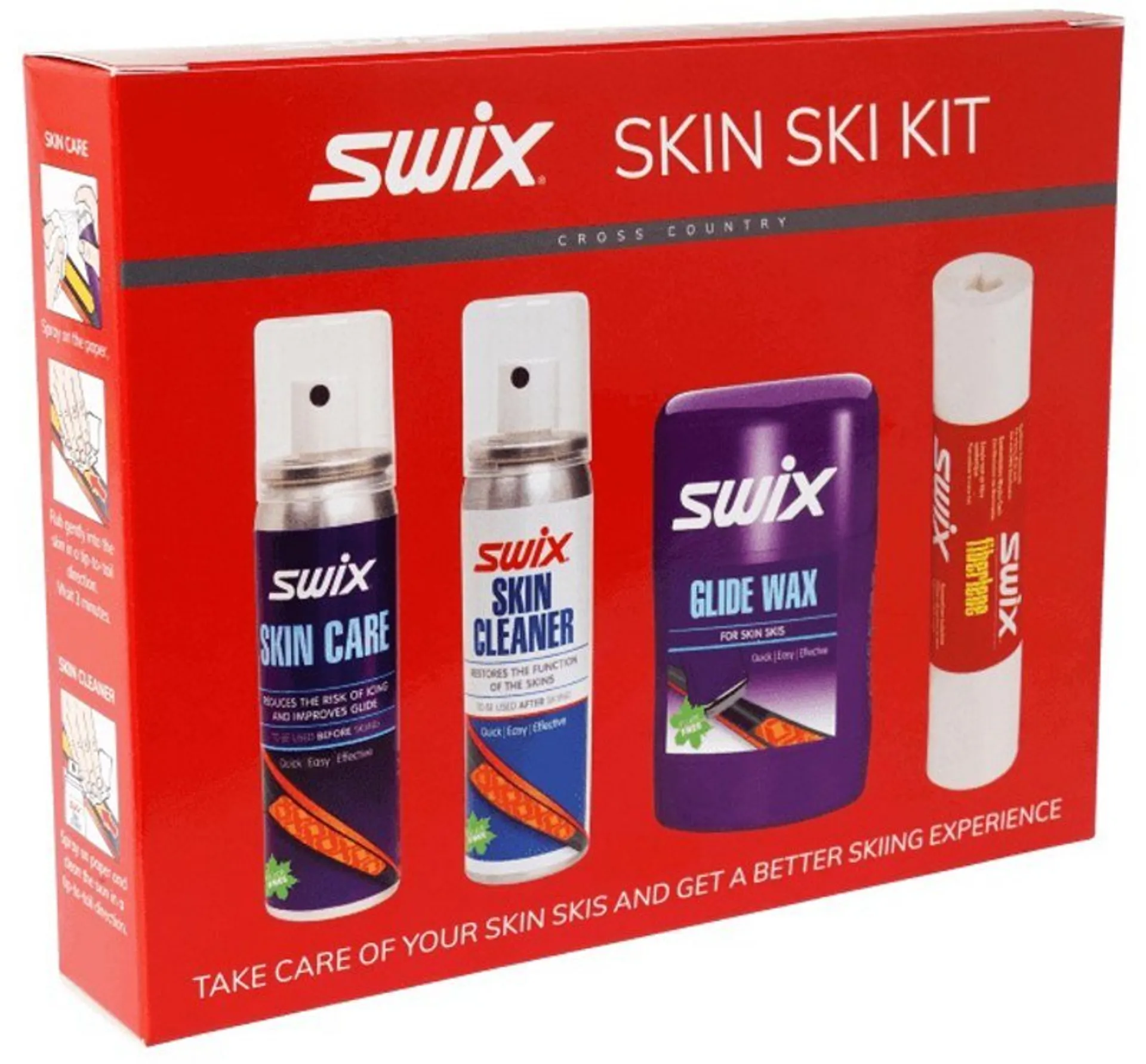 Sada Swix P15N pro údržbu lyží s integrovanými pásy. Obsahuje péči o pásy N15, čistič pásů N16, skluzný vosk N19 a papír Fiberlene pro aplikaci.
