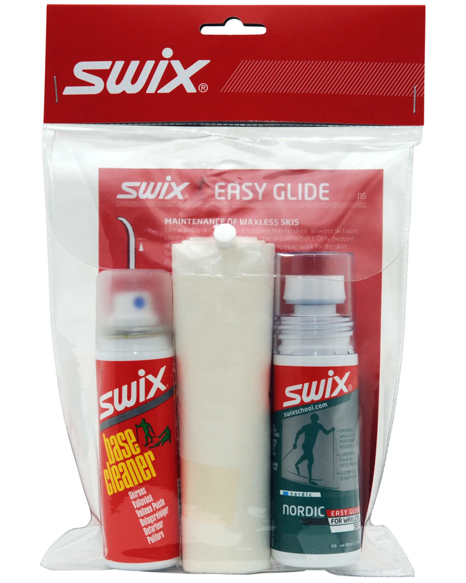 Sada obsahuje univerzální tekutý vosk, který se nanáží po celé délce běžek včetně šupin, čistič a utěrku na setření starých vosků.